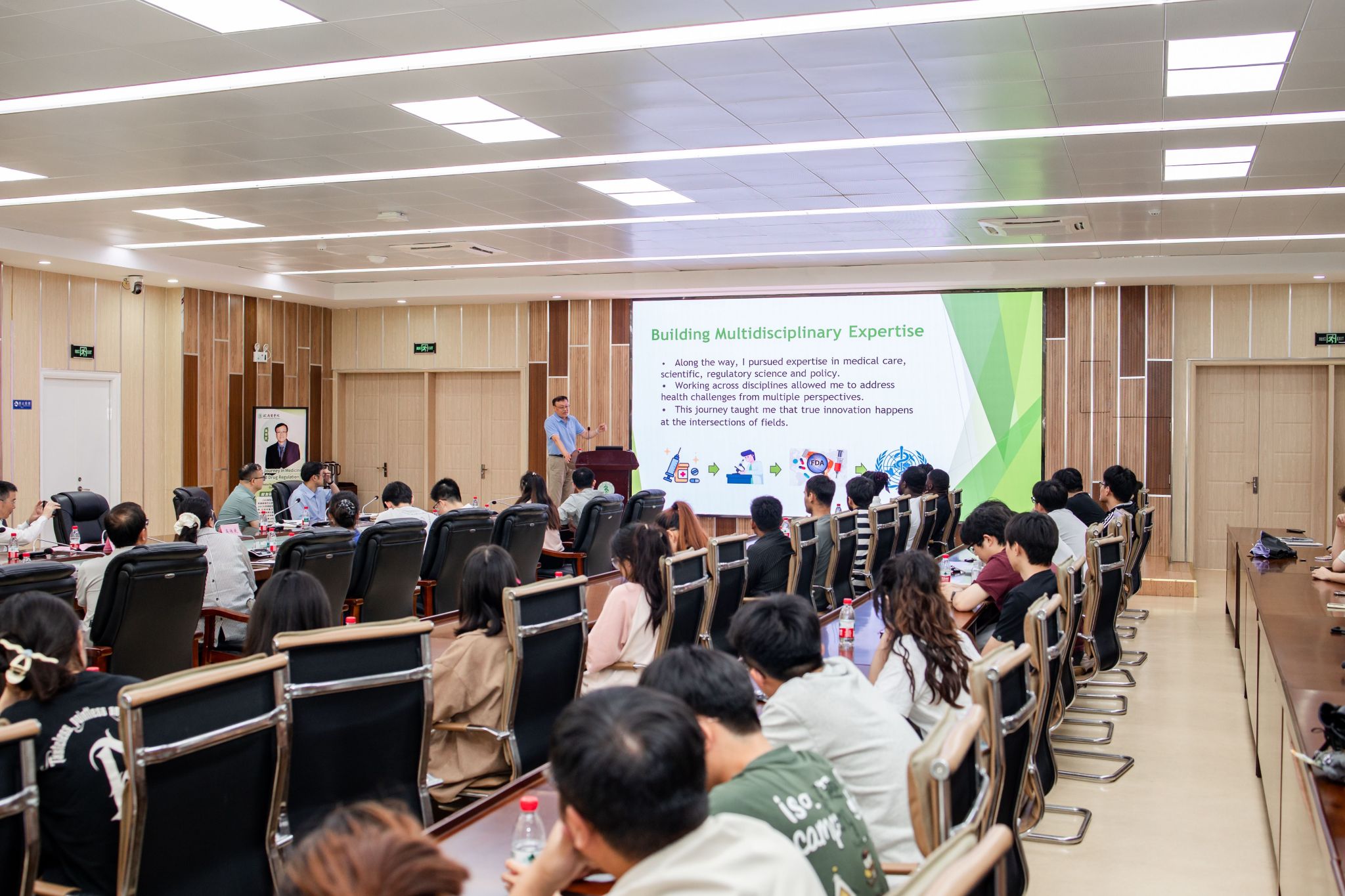 在论坛分享中,吴传庆校友结合自身经历,生动讲述了从医学生成长为多学科专家和全球监管领导者的历程。他分享了在不同国家、不同学术机构求学与工作的宝贵经验,深入剖析了医学研究与药品监管领域的发展趋势,以及面临的挑战与机遇。其分享内容丰富、见解独到,不仅让在场师生领略到了国际前沿的医学与药品监管动态,更为在校学生的未来职业发展提供了全新的思路和方向。现场师生认真聆听,踊跃参与互动提问,现场气氛热烈。