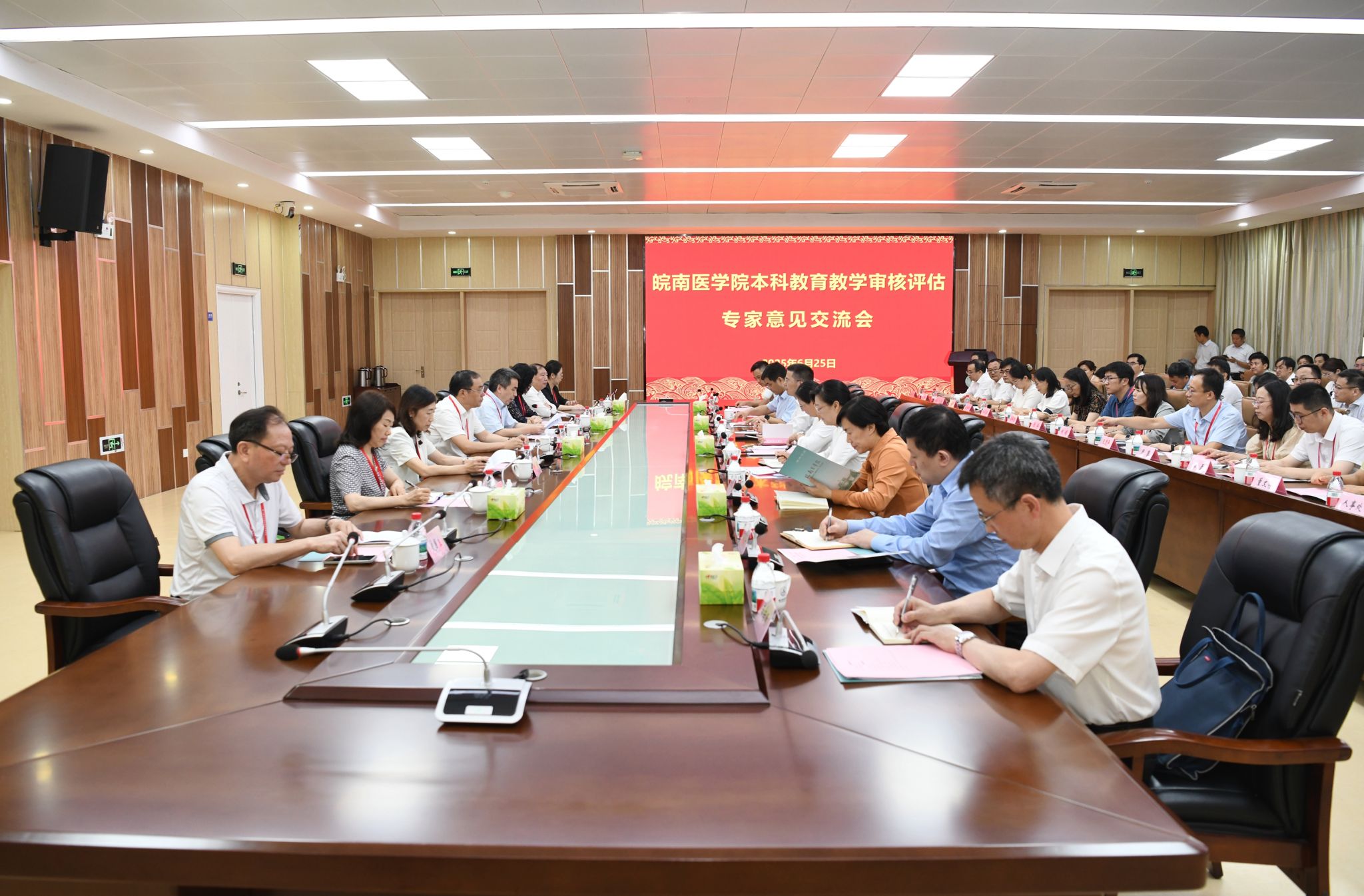 自5月26日始,由河北医科大学原校长崔慧先教授任组长,安徽医科大学副校长吕雄文教授任副组长,西南医科大学党委副书记、校长何涛教授,南方医科大学党委副书记、校长马骊教授,温州医科大学副校长朱雪波教授,中国药科大学副校长姚和权教授,温州大学副校长王尧骏教授,安徽理工大学副校长鲁超教授,新疆医科大学副校长刘涛教授,安徽中医药大学副校长桂双英教授,蚌埠医科大学副校长陈昌杰教授,阜阳师范大学原副校长汪芳启教授,南京体育学院原党委副书记、副校长史国生教授,南京医科大学教务处处长喻荣彬教授,上海中医药大学教务处处长张亭立教授组成的15位评估专家组,对学校进行了为期3周的线上评估,通过召开线上见面会、全面审读“1+3+3”报告、调阅教学档案材料、看课听课、访谈座谈等多种形式,对学校本科教育教学工作进行了全面检查、问诊把脉。6月23日至25日,由崔慧先组长带队的8位专家组成的专家组一行进校开展现场考察求证及实地工作指导,集体考察了校史馆、基础医学院、临床智慧医教中心、5G+急救实验实训中心等教学平台,走访了第一附属医院、第二附属医院、芜湖市第二人民医院、长江药业等校内外实践教学基地,访谈了校领导及相关职能部门、二级学院领导班子,实地考察了教室、实验室、学生餐厅、学生宿舍等设施条件,查阅了相关支撑材料,对线上评估期间存疑问题进行了充分论证,全面深入了解学校本科教育教学工作情况。