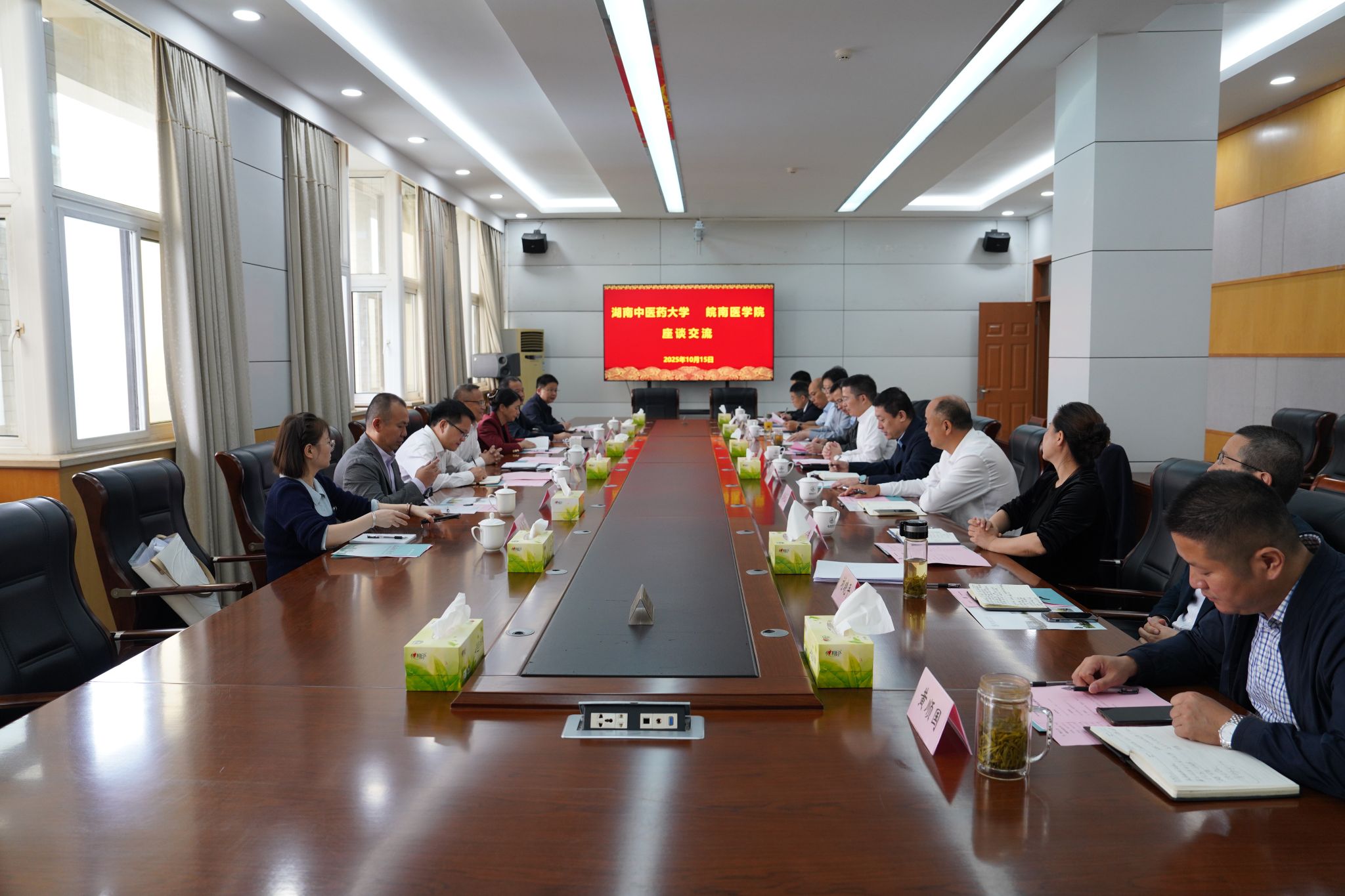 10月15日,湖南中医药大学党委副书记、校长易刚强,宁乡市人民政府副市长喻林义,宁乡市人民医院党委书记刘亮,太和县人民医院副院长范吉利等一行来校调研交流,学校党委副书记、院长姚应水,党委常委、副院长韩永升、余结根陪同调研。
