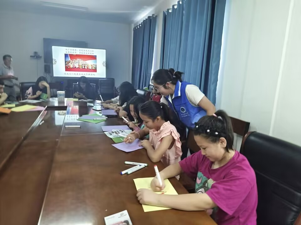 笔墨共书民族情,手账同载万家心。文化交流结束后,志愿者和小朋友们围聚一堂,共同投身于民族团结手抄报的创作中。孩子们围坐在铺展着彩纸的长桌旁,执起了梦想的画笔,有的孩子细致描绘着民族的特色服饰,斑斓服饰在画纸上错落分布,勾勒出凝聚着纯真心意的文化元素;有的孩子一笔一画写下心中所想,用稚嫩的语言刻画出童真的民族团结图景,每一处笔墨都寄托着对“民族团结一家亲”的深切认同。创作间隙,孩子们还不时凑近交流各民族的家乡事,小小的手抄报化作传递文化的载体,成为联结民族情感的纽带。