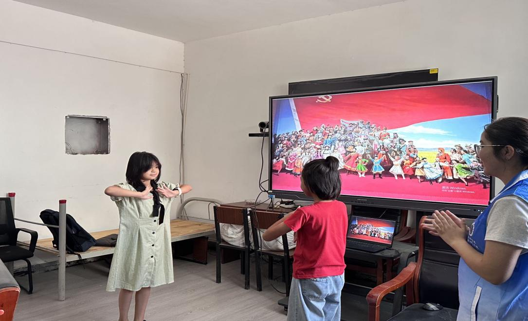 乐舞润疆聚欢乐,艺汇情通一脉连。紧随其后的“文化破冰”环节,再次将现场气氛推向高潮。活动场内乐舞交融,心灵激荡。来自新疆的小朋友率先展露热情,主动带领其他小伙伴一起学跳维吾尔族的舞蹈,领略新疆文化的独特魅力。她们灵动的舞步与灿烂的笑容极具感染力,在其耐心指导下,大家从起初的生疏慢慢渐入佳境,现场欢笑声、节拍声交织,暖意融融。一招一式、举手投足间“石榴籽”们越抱越紧,心意与情感在相视而笑中彼此交融,民族团结的根基也在一次次真诚的互动中愈发坚实。