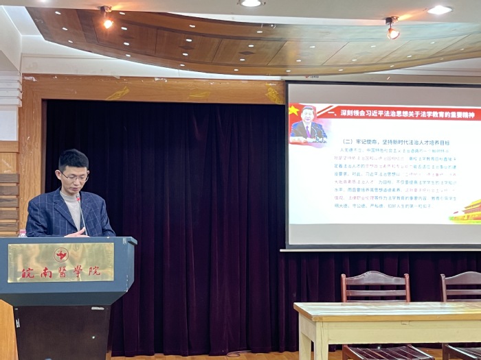 4月27日晚,人文与管理学院联合科研处在赭麓校区举办第二期“赭麓法律讲堂”,合肥工业大学文法学院法律系主任周乾教授应邀作“以习近平法治思想指导新时代法学教育”专题报告。报告会由人文与管理学院党委书记王军主持,法学教研室专兼职教师和各年级法学专业学生参加。