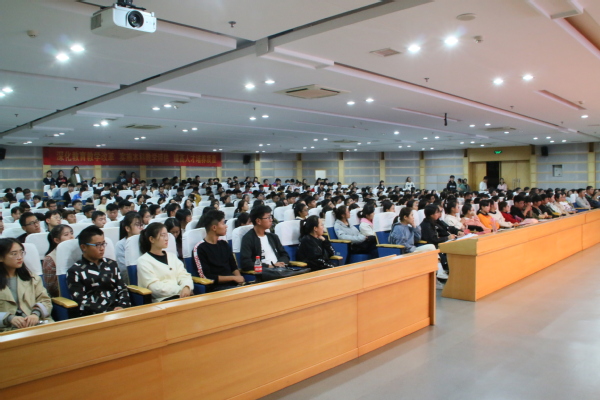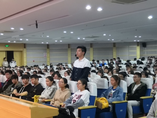 讲座安排了交流互动环节,现场同学热情高涨、积极提问。任坤学长从新生的阶段性适应、如何找到正确的学习方法、怎样学好英语、确立考研方向等方面给予了宝贵的建议和意见。首先,他鼓励同学们要坚定信念方向,勇于表达、展现自己;其次,要多读书、读好书、善读书,学习是永无止境的,无论处在怎样的境地,都要保持对知识不懈追求的动力,不断充实自己的知识财富;最后,要保持乐观积极的心态,抛弃抱怨、多思进取,做主动追求幸福生活的探索者。