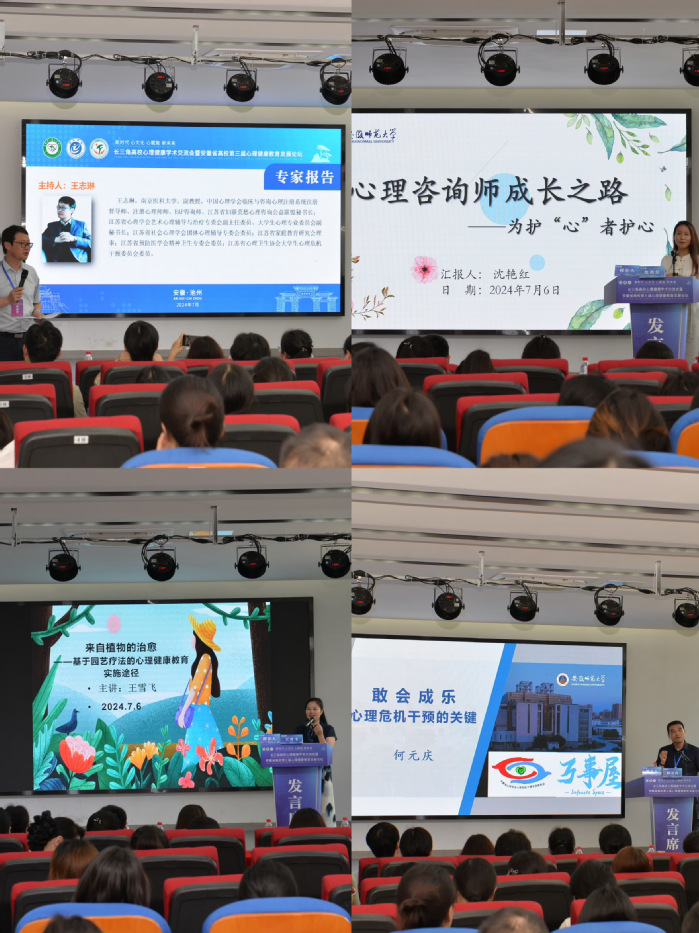 本次会议以“新时代 心文化 心赋能 新未来”为主题,邀请了北京航空航天大学马喜亭教授、南京审计大学蔡智勇教授、上海学生心理健康发展中心李正云教授、安徽医科大学朱春燕教授等长三角高校专家,围绕心理咨询与辅导、家校共育、心理危机预警与干预、青少年心理障碍的治疗与康复等主题开展学术报告。会议还按照学工处长和院系书记、专兼职咨询师、辅导员和班主任等分类进行分论坛报告,对高校心理健康教育与管理工作进行先进经验交流。此次会议采用学术报告和经验分享相结合的形式,有力促进了各高校间关于心理健康教育工作的沟通和交流。